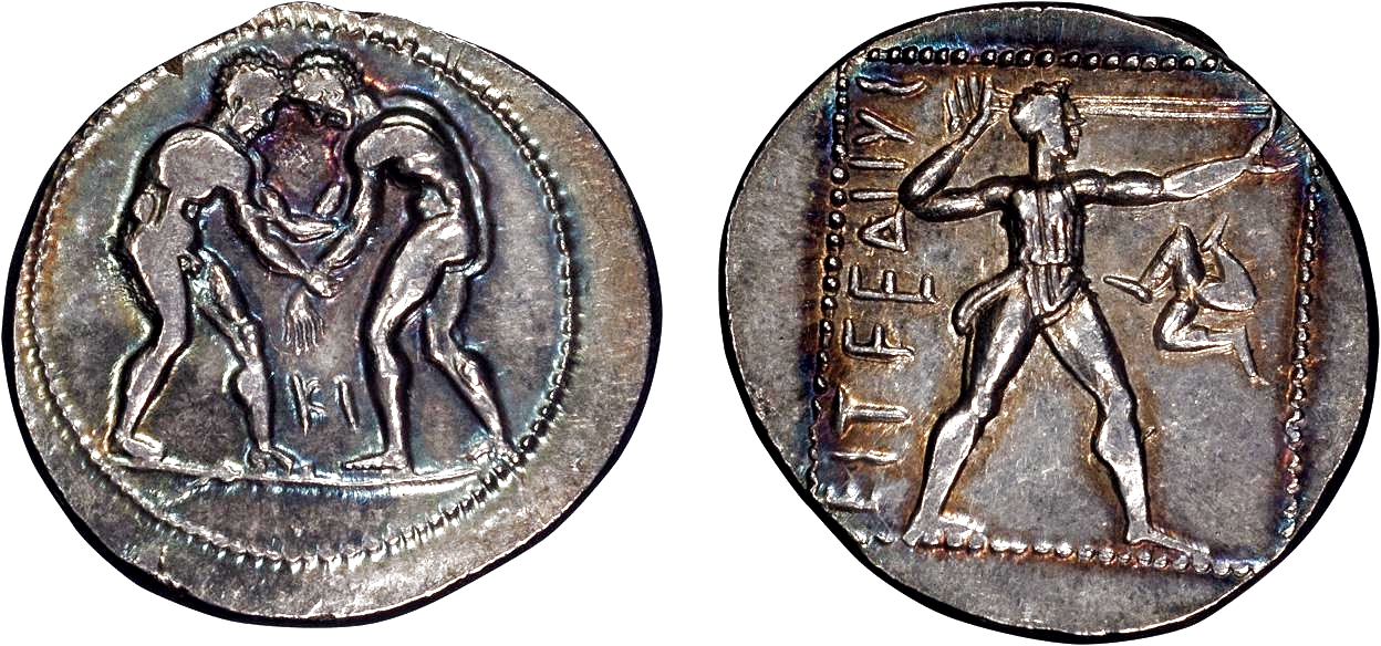 [82]. <Aspendos, Pamphylia, Asia Minor, AR Stater ca. 380/75-330/25 BCE >. Αντιγράφουμε σχετικό σχόλιο (https://www.numisforums.com/topic/560-aspendos-staters-ancient-frozen-poetry-in-motion/#comment-9764): Obv. Two standing wrestlers, naked, grappling with legs spread apart and heads touching; wrestler on left grasps his opponent’s left wrist with his right hand, and left elbow with his left hand; wrestler on right grasps his opponent’s left arm with his right hand; letters “KI” [for name of minting magistrate] in field between wrestlers, below knee level / Rev. Slinger wearing short chiton, standing with trunk in facing position, head and legs in profile facing right, legs held straight with feet apart, left arm extended forward holding sling with left thumb, right arm drawing sling back with elbow bent; triskeles in right field with legs running left; ΕΣΤϜΕΔΙΙΥΣ [adjectival form of city name Estwediius in Pamphylian dialect of Ancient Greek] upwards behind slinger; all contained within square dotted border. SNG Copenhagen 226 [Sylloge Nummorum Graecorum, Copenhagen, The Royal Collection of Coins and Medals, Danish National Museum, Part 31, Lycia, Pamphylia (Copenhagen 1955)]; SNG Von Aulock II 4557 [Sylloge Nummorum Graecorum, Deutschland, Sammlung Hans Von Aulock, Vol. 2: Caria, Lydia, Phrygia, Lycia, Pamphylia (Berlin 1962)]; BMC 19 Lycia 45-46 [both with initials “KI” on obv.] [Hill, G.F. A Catalogue of Greek Coins in the British Museum, Lycia, Pamphylia, and Pisidia (London, 1897) at p. 99]; Sear GCV Vol. II 5397 (obv. var. -- diff. magistrate’s initials) [Sear, David, Greek Coins and their Values, Vol. II, Asia & Africa (Seaby 1979) at p. 491], 26 mm., 10.96 g. Purchased from Harlan J. Berk, Ltd., 217th Buy or Bid Sale, 17 Sep. 2021, Lot 132; ex Harlan J. Berk, Ltd., 7 March 2001.*